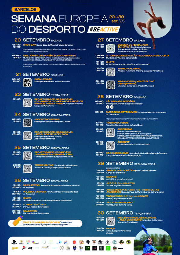 De 20 a 30 de setembro, no âmbito da Semana Europeia do Desporto, o Município de Barcelos e entidades parceiras promovem um vasto programa de atividades desportivas em vários espaços da cidade, convidando todos os barcelenses a participar.