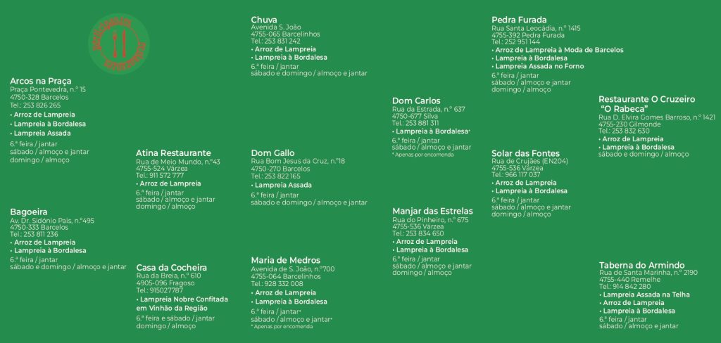 Entre outros, estes são os restaurantes onde pode encontrar pratos de lampreia a seu gosto, mas é aconselhável reservar mesa com antecedência: Arcos na Praça (Barcelos), Atina Restaurante (Várzea), Bagoeira (Barcelos), Casa da Cocheira (Fragoso), Chuva (Barcelinhos), Dom Carlos (Silva), Dom Gallo (Barcelos), Manjar das Estrelas (Várzea), Maria de Medros (Barcelinhos), Pedra Furada (Pedra Furada), Restaurante O Cruzeiro “O Rabeca” (Gilmonde), Solar das Fontes (Várzea), Taberna do Armindo (Remelhe), Taberna Lopes (Gilmonde), Taberninha O Chico (Perelhal).