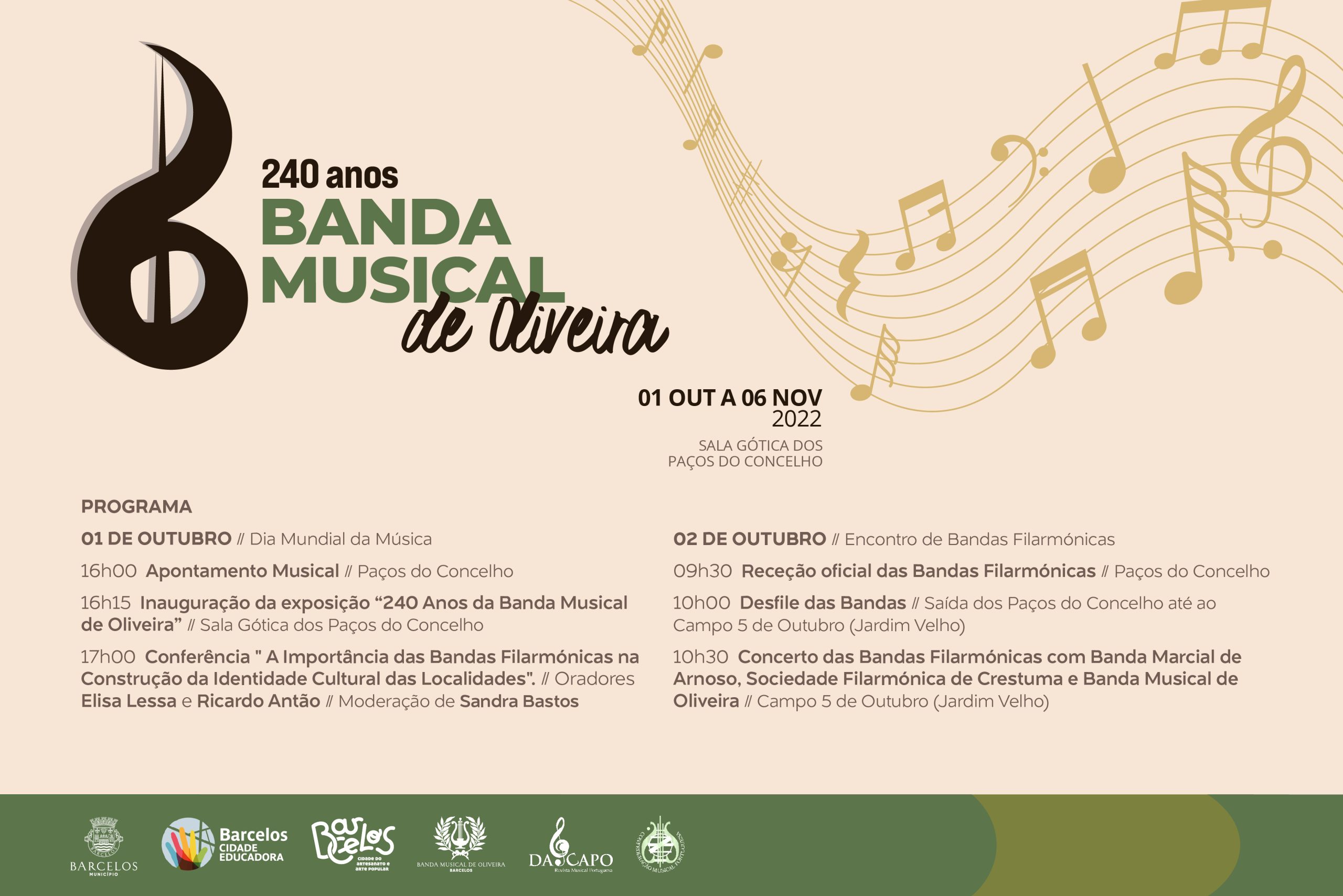 A Exposição “240 anos da Banda Musical de Oliveira” é apenas um dos pontos altos do programa deste evento. Antes da inauguração da Mostra que acontece às 16h15, há um momento musical, sendo que depois, pelas 17h00, segue-se a realização da Conferência “A importância das Bandas Filarmónicas na Construção da Identidade Cultural das Localidades”, com os oradores: Elisa Lessa e Ricardo Antão, e moderação de Sandra Bastos.