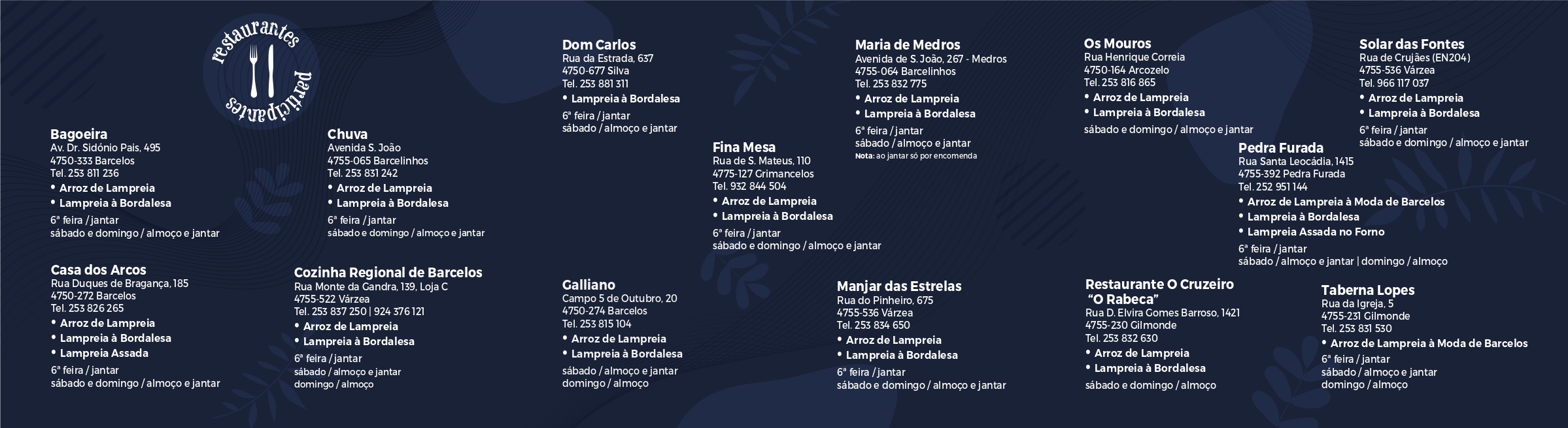 A iniciativa, que já vai para a 9ª edição, visa atrair fluxos de turismo gastronómico ao território barcelense e captar clientes amantes desta iguaria para os restaurantes locais. Produto local de excelente qualidade, este pode ser confecionado de variadas formas para agradar aos paladares mais exigentes, nomeadamente, Arroz de Lampreia, Lampreia à Bordalesa, Lampreia Assada. A degustação desta iguaria ficará ainda mais completa se a refeição for acompanha por um saboroso Vinho Verde de Barcelos.