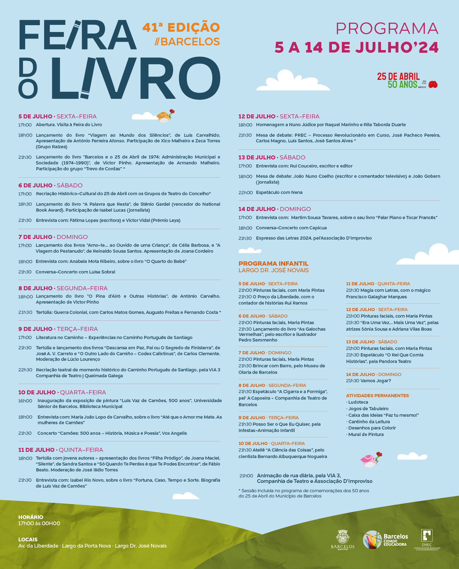 Quem vier ao centro de Barcelos entre os dias 5 e 14 de julho vai encontrar uma minicidade de livros, composta por 21 stands e 94 editoras e pontuada por inúmeras ações, entre as quais o lançamento de novas obras, conversas com escritores, concertos, animação de rua, e grande destaque, no dia 6 de julho, às 5 da tarde, para a Recriação do 25 de Abril pelos Grupos de Teatro do Concelho.